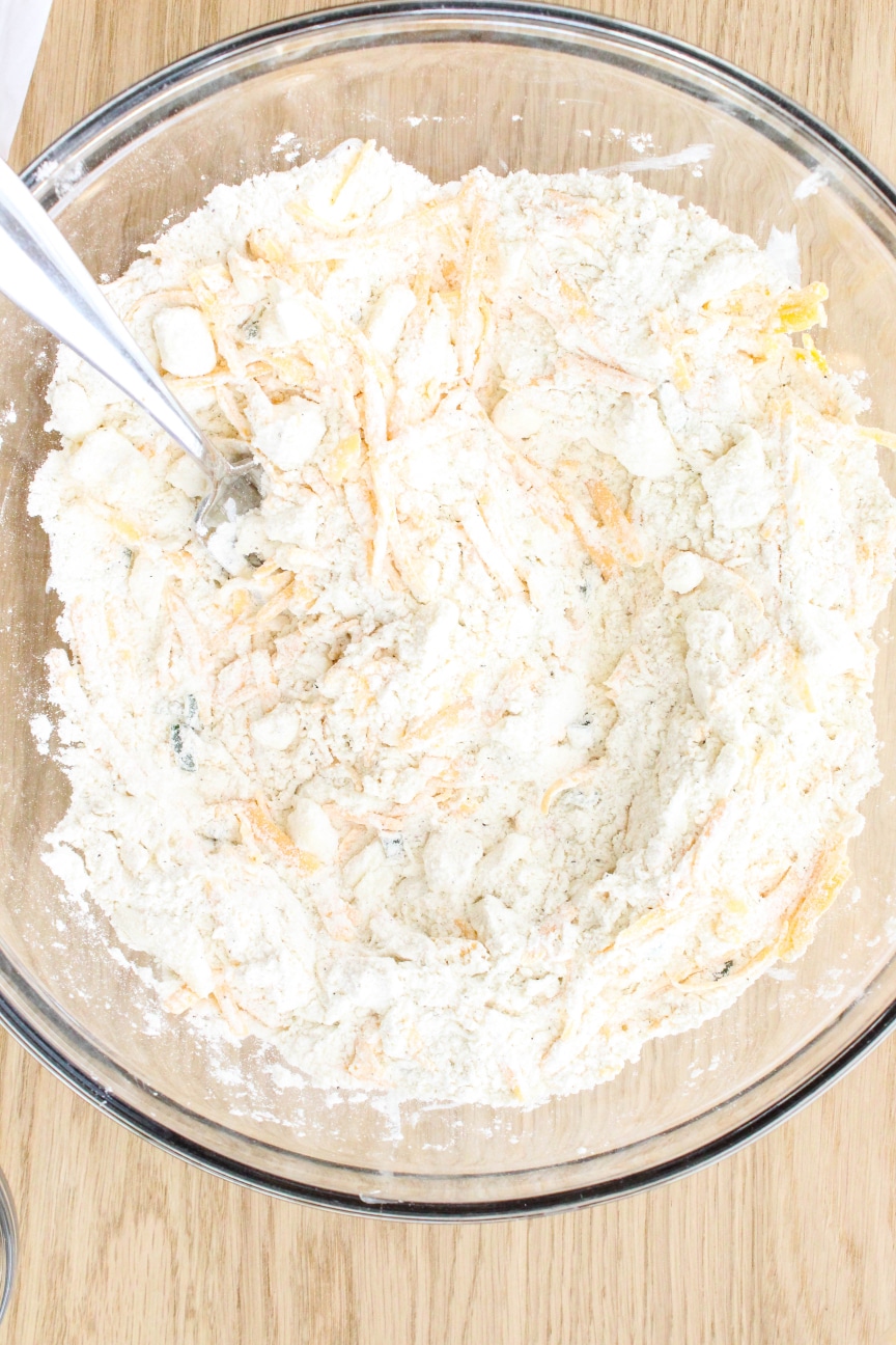This recipe makes a pretty classic flakey buttermilk biscuit. It starts by mixing up the dry ingredients and cutting in cold butter with your hands or a pastry cutter. Then, we’re tossing in shredded cheddar cheese and chopped up peppers of your choice until everything is coated and looking like this: