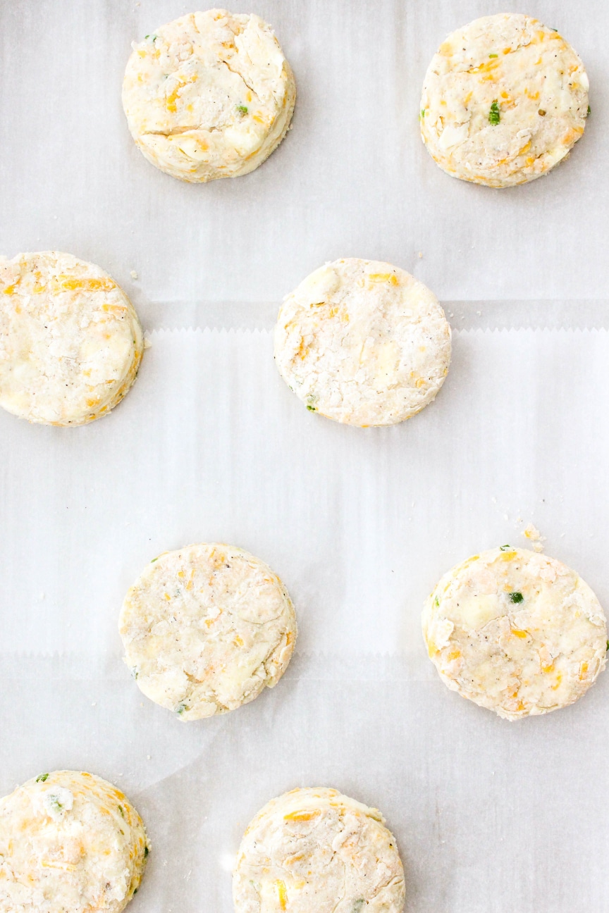 These biscuits have lots of shredded cheddar cheese and chopped Serrano peppers running throughout for a little spice. Let’s get to it!